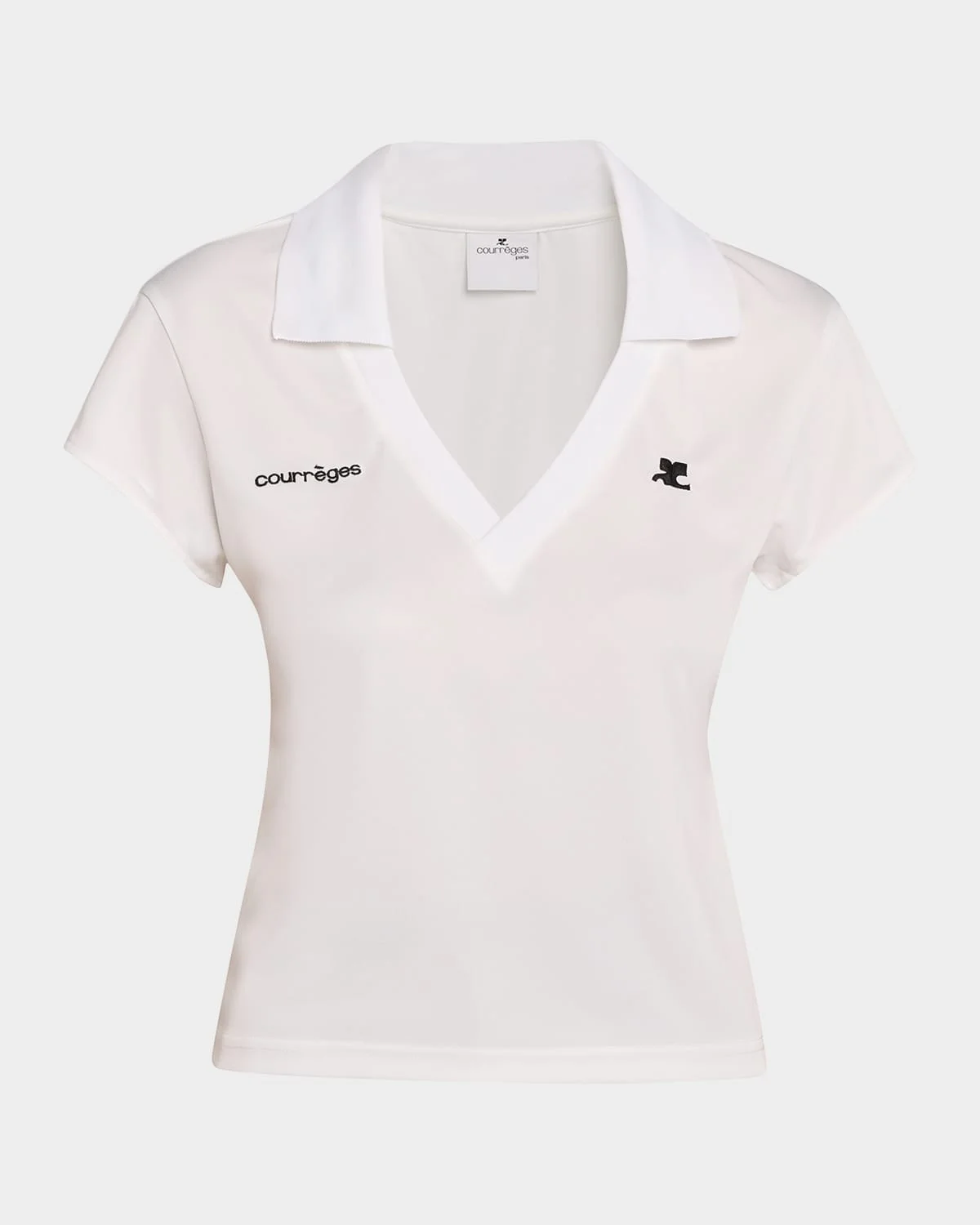 Crafted from cotton stretch, this sports polo top from Courreges features embroidered logos on the chest V neckline with spread collar Short sleeves Slim fit Cropped at the hip Pullover style Cotton/elastane Made in Bulgaria SIZE & FITModel measurements: 5 & apos;10" tallModel is wearing a US size 4/Small