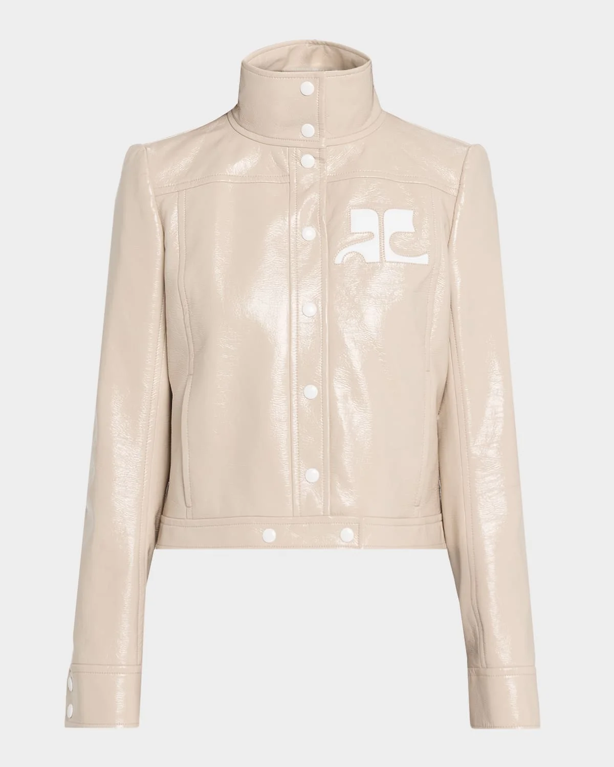 Courreges textured vinyl jacket featuring contrast logo patch chest Part of the Iconic vinyl collection Approx. 19"L from shoulder to hem; 25.2" sleeve length Spread collar; snap front Long sleeves Side slip pockets Straight fit Cropped length Cotton Cupro, lining Imported