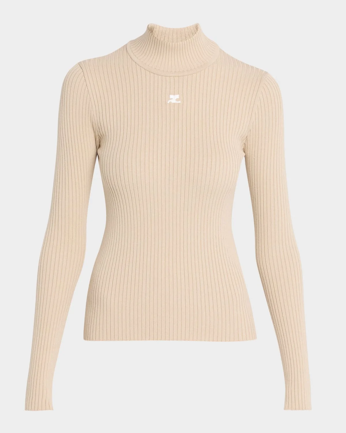Courreges rib sweater featuring contrast logo embroidered front Turtleneck Long sleeves Fitted Pullover style Viscose Imported