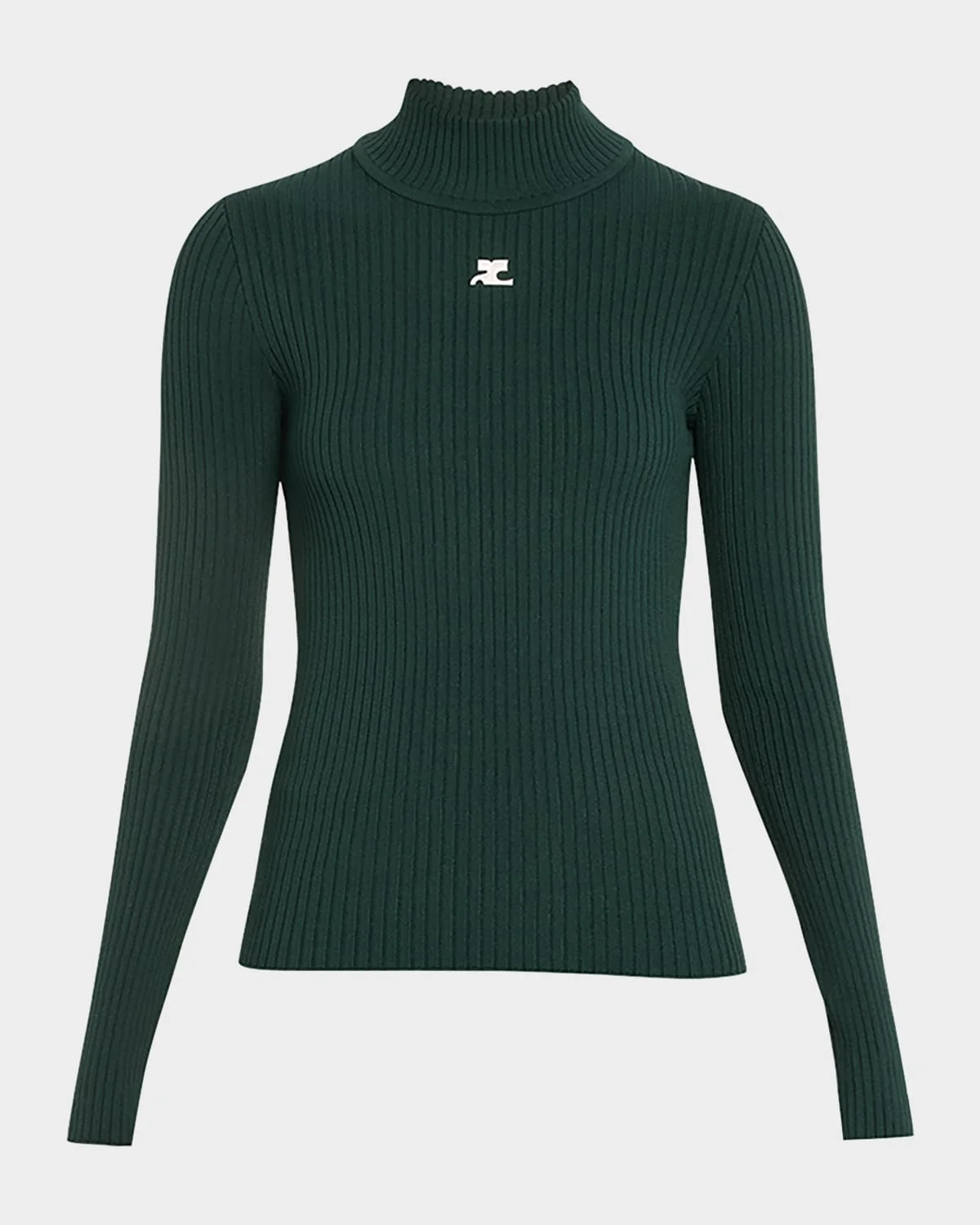 Courreges rib sweater featuring contrast logo embroidered front Turtleneck Long sleeves Fitted Pullover style Viscose Imported
