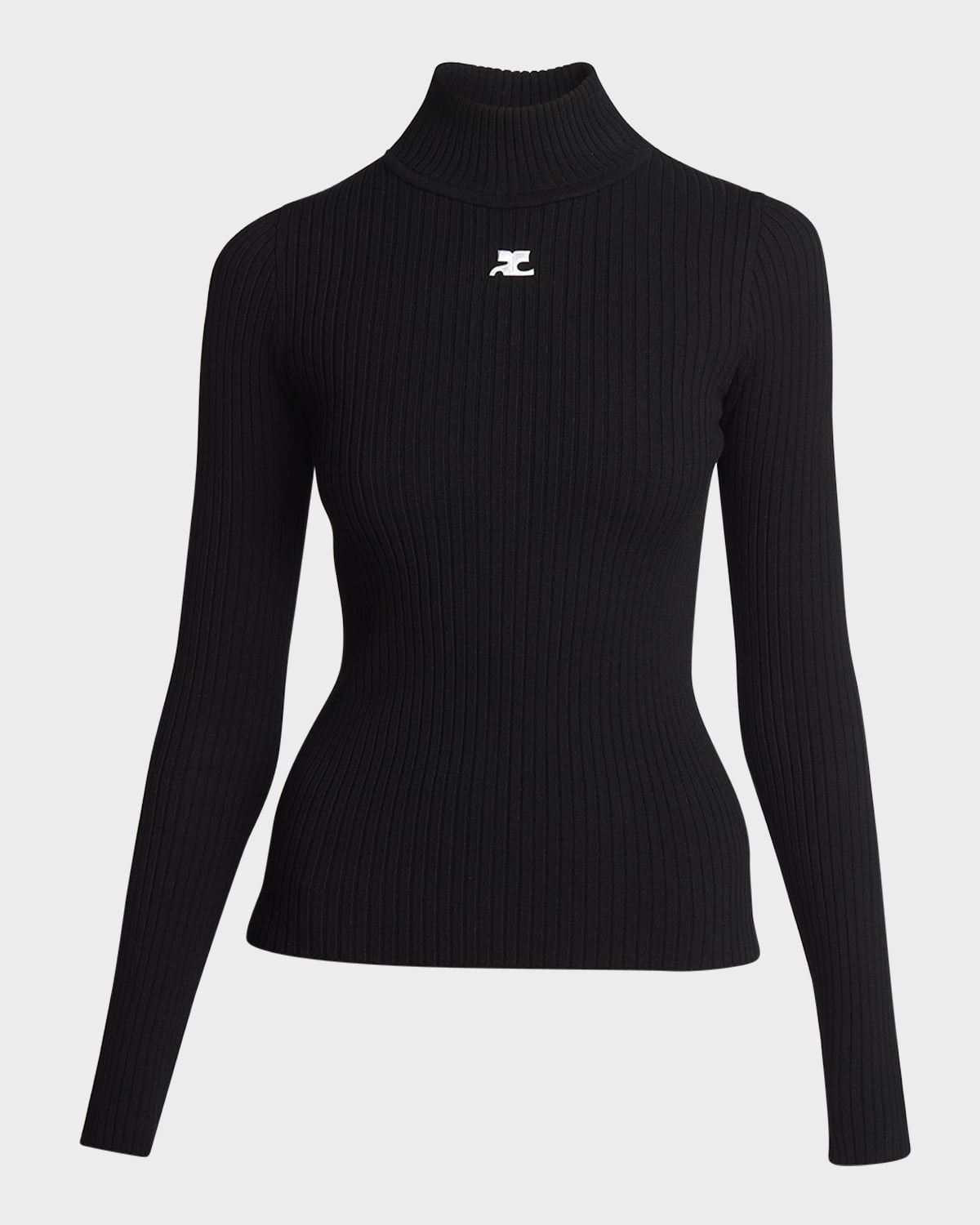 Courreges rib sweater featuring contrast logo embroidered front Turtleneck Long sleeves Fitted Pullover style Viscose Imported
