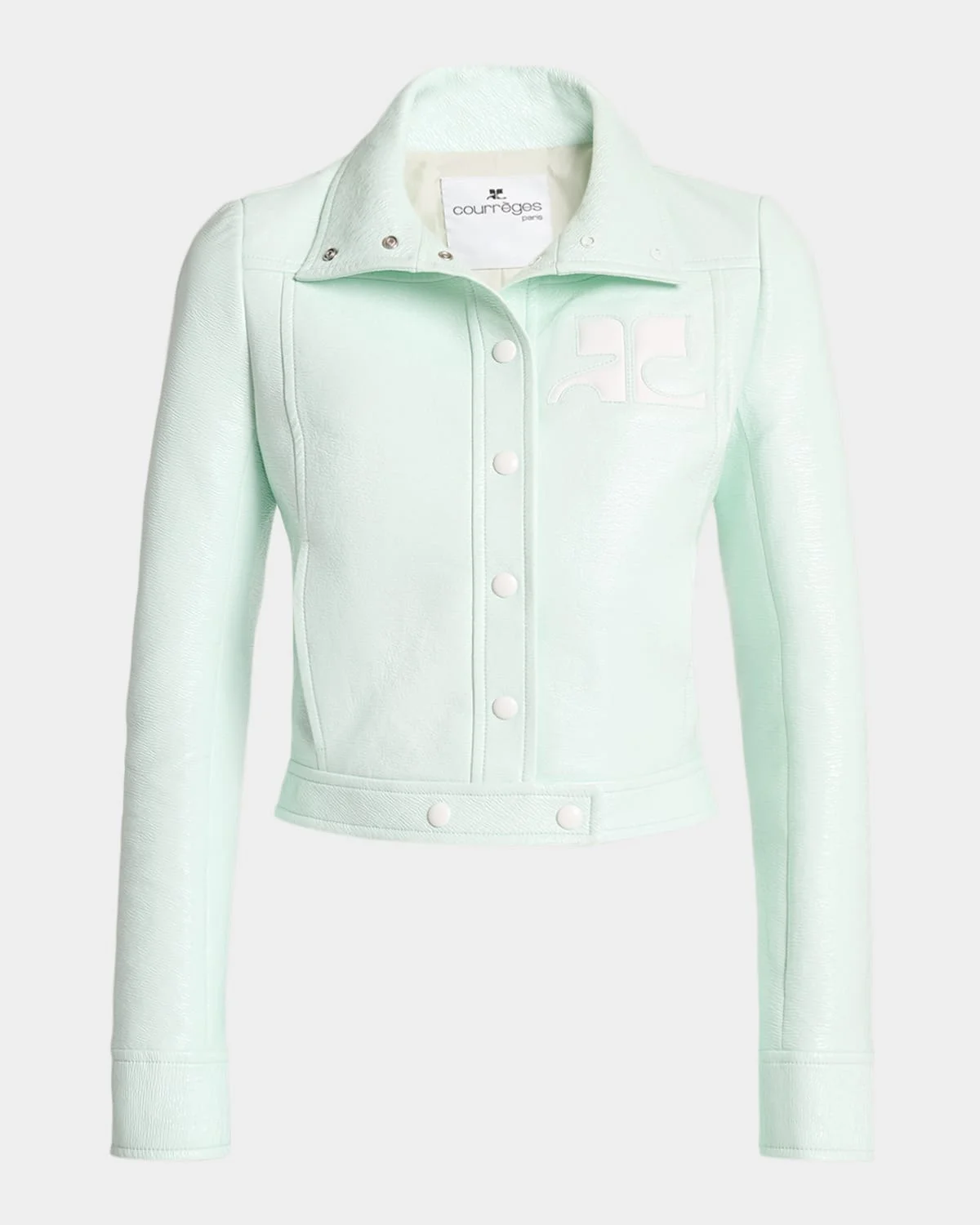 Courreges vinyl & nbsp;re-edition jacket featuring logo front Spread collar; snap front Long sleeves; snap cuffs Side slip pockets Slim fit Cotton/polyurethane/elastane Lining: Cupro Imported Model is 5 & apos;10"/177cm.