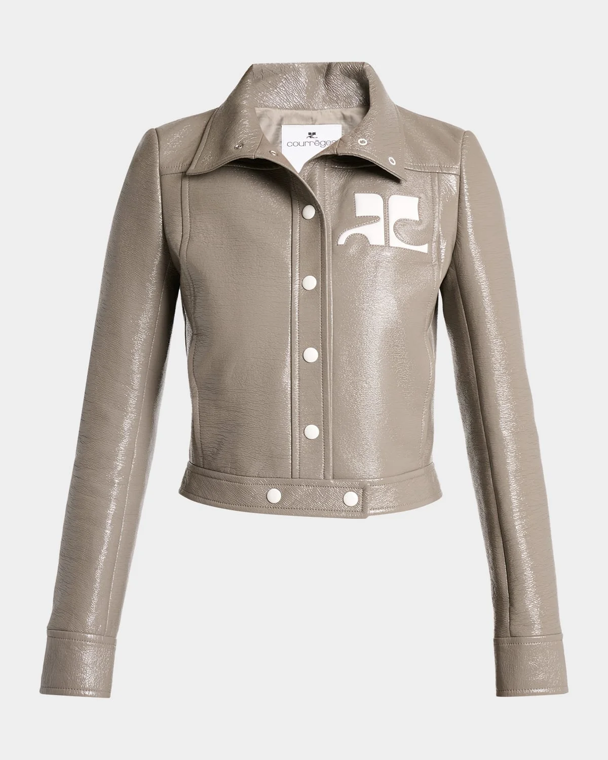 Courreges vinyl & nbsp;re-edition jacket featuring logo front Spread collar; snap front Long sleeves; snap cuffs Side slip pockets Slim fit Cotton/polyurethane/elastane Lining: Cupro Imported Model is 5 & apos;10"/177cm.