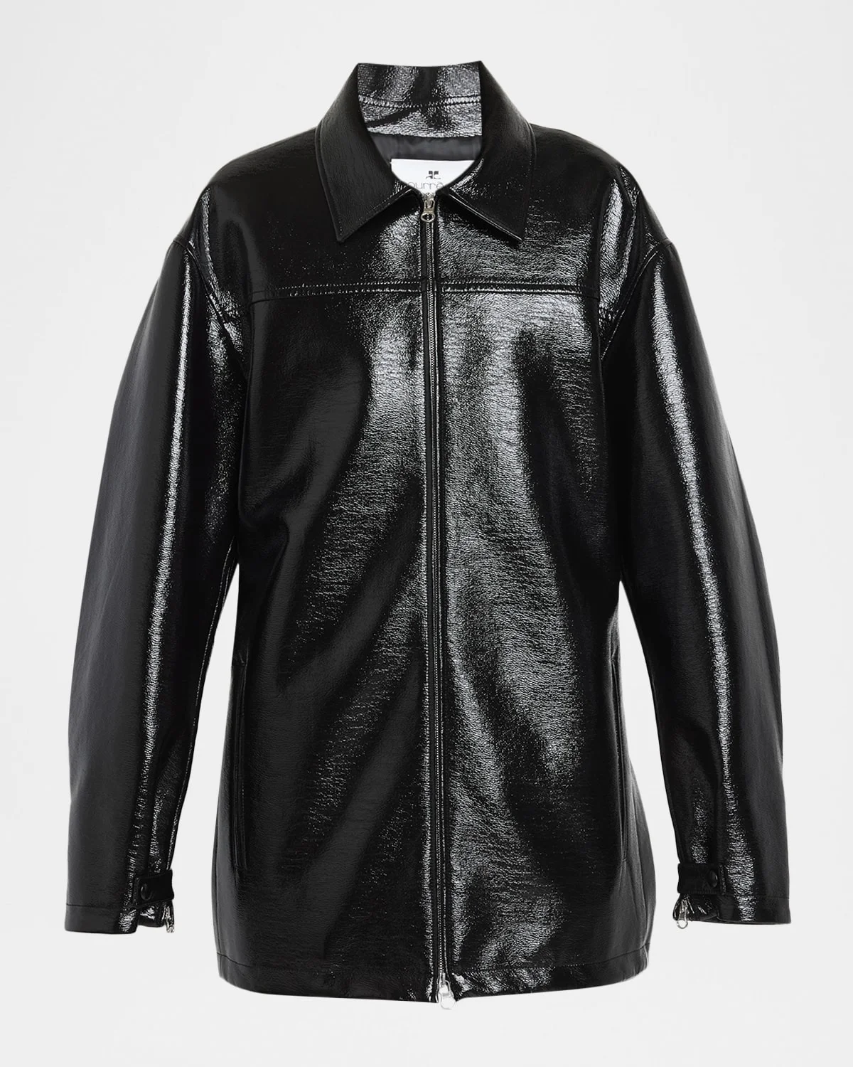 Courreges jacket is tailored in a shiny vinyl featuring shoulder yokes, logo embroidered back of collar, and a buttontab waist strap on the back Point collar; twoway zip front Long sleeves Hip welt pockets Straight fit Hem falls below the hip Cotton/polyurethane/elastane Imported