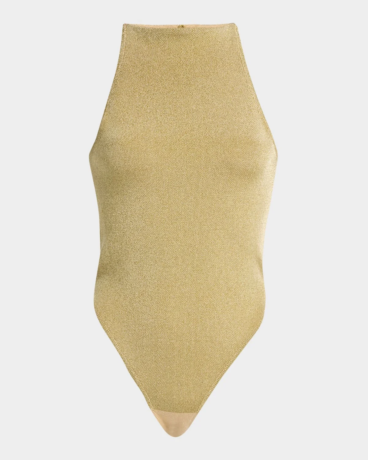 - Cult Gaia "Cassius" bodysuit crafted from a shimmering gold chainmail knit yarn - Flattering high neckline - Sleeveless - Invisible back zipper - Viscose/rayon/cellulose acetate/nylon/polyamide - Imported