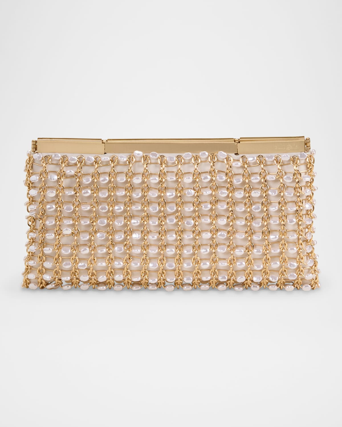 - Cult Gaia "Felice" crossbody bag in allover faux pearls and brass - Detachable chain shoulder strap - Can be worn as a clutch or shoulder bag - Framed top - Approx. 4.3"H x 9.5"W x 1.8"D - Plastic - Spot clean - Imported