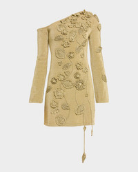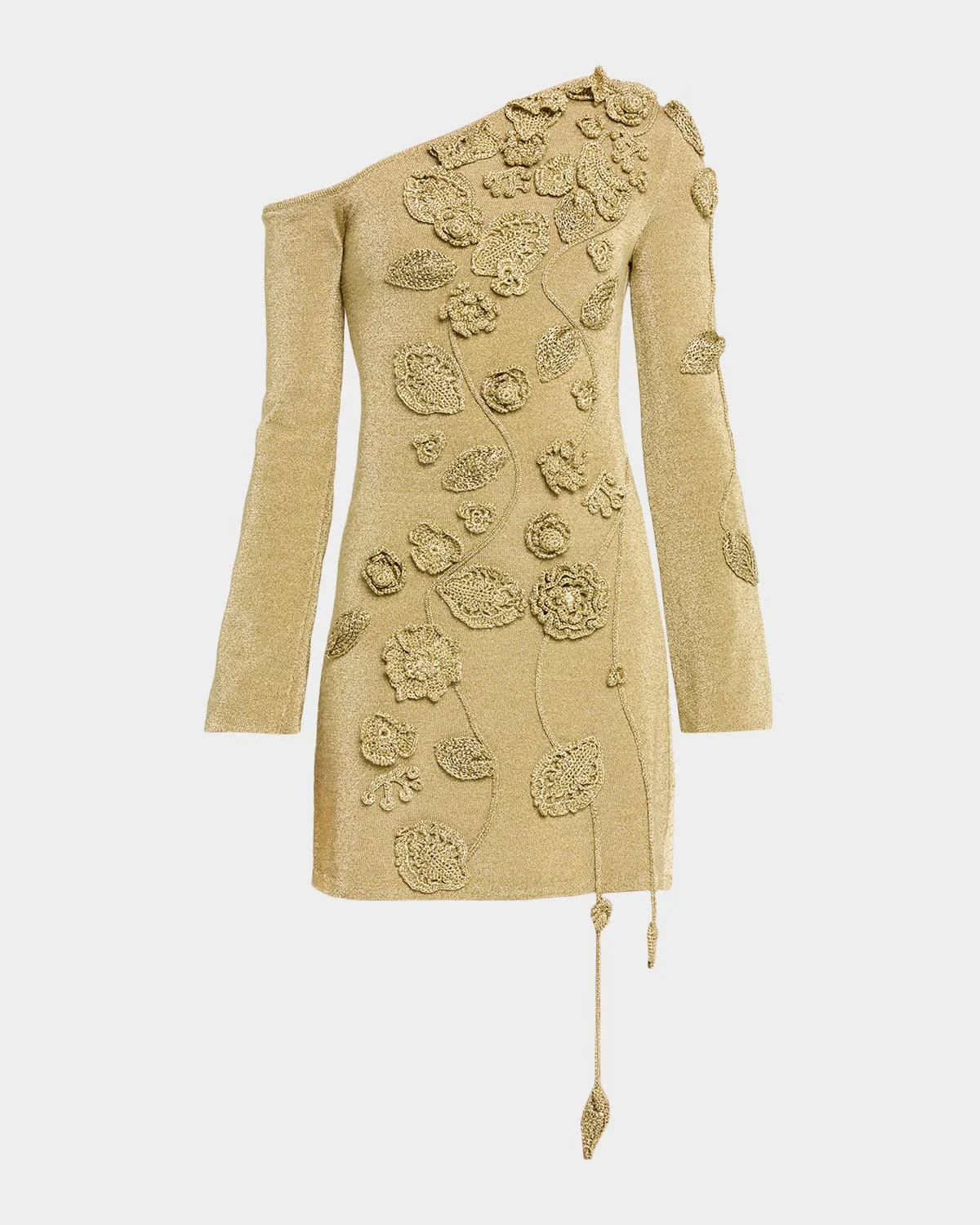 Cult Gaia's "Kaela" mini dress is knit with metallic accents and embellished with handcrocheted 3D floral appliques across the bodice and sleeves. Approx. 33"L from shoulder to hem Oneshoulder neckline Long sleeves Hem falls above the knee Slipover style Viscose/polyester/nylon/spandex Dry clean Imported