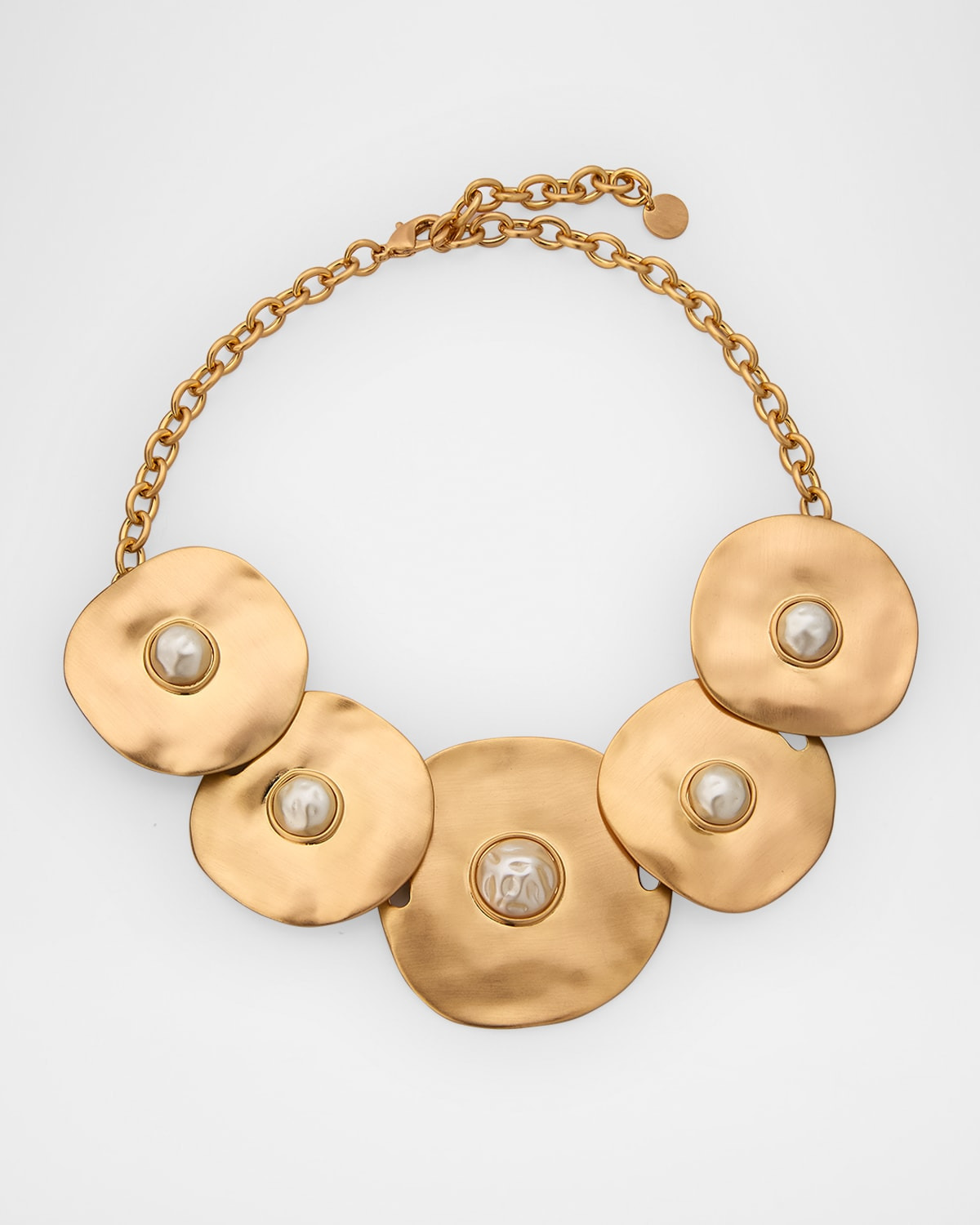 - Cult Gaia statement choker necklace - Gold-tone brass chain and hammered circular discs - Central plastic faux pearls - Adjustable length - Lobster clasp - Imported