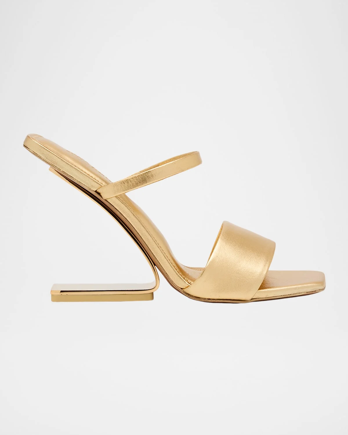 Cult gaia "Rene" sandals are crafted of metallic lambskin leather with a golden ABS architectural heel 4.33 in / 110 mm architectural heel Open square toe Single vamp strap Stretch upper strap Slipon style Spot clean Made in Brazil