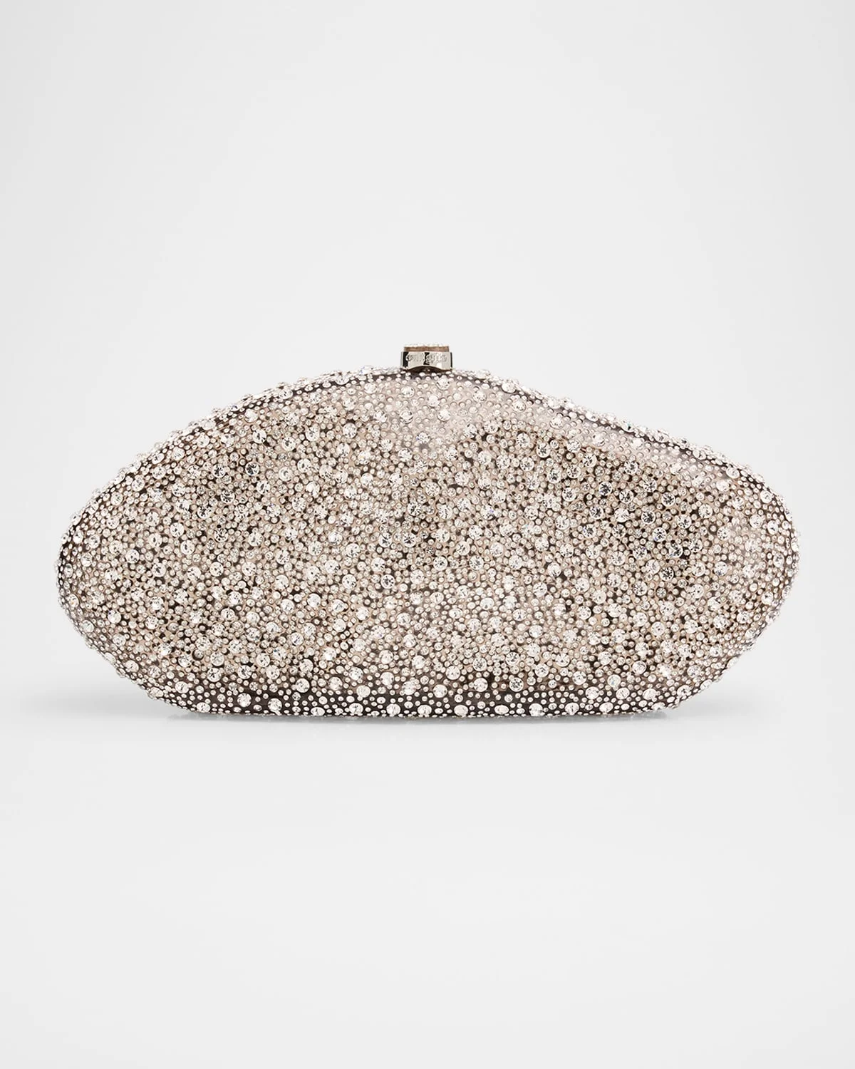 This Cult Gaia "The Caldera" acrylic clutch bag glitters with encrusted glass rhinestones, designed with gentle rises and dents for a sculptural silhouette Framed top with silvertone clasp Approx. 5"H x 11"W x 3.3"D Spot clean Imported