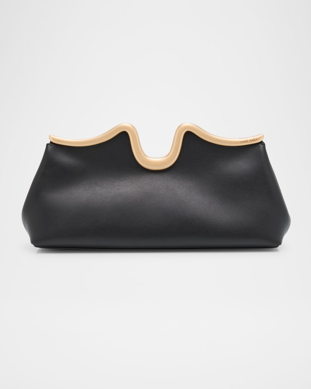- Cult Gaia "Valma" sculptural clutch bag in leather, detailed with wavy brass trim - Detachable chain shoulder strap - Can be worn as a clutch or shoulder strap - Framed top - Lining: Polyester - Trim: Zinc alloy - Approx. 5"H x 11.6"W x 3.2"D - Imported