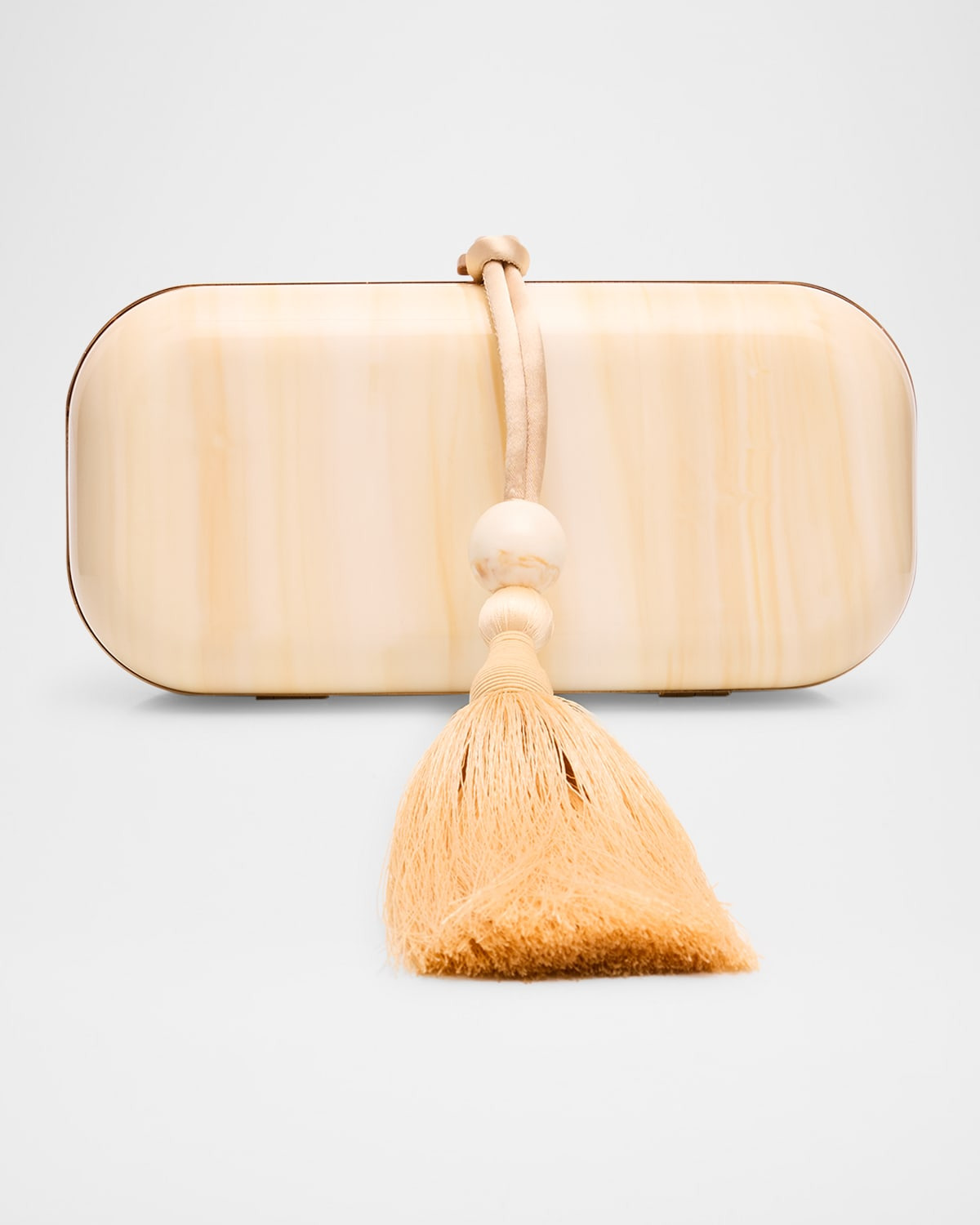 - Cult Gaia "Yasmin" clutch bag in marbled acrylic, adorned with a beaded tassel - Framed top with clasp closure - Lining: Polyester - Trim: Metal - Approx. 3.9"H x 8.9"W x 2.4"D - Imported