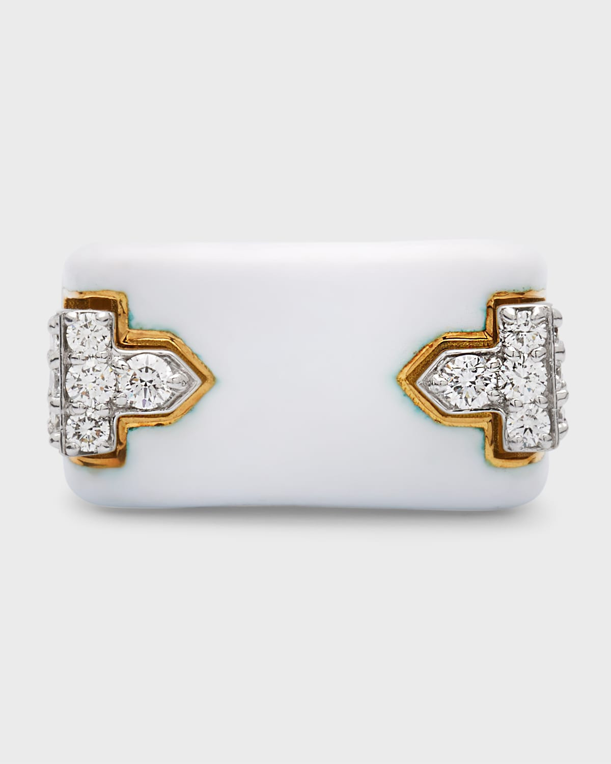 David Webb hero ring from the Motif Collection. Polished 18karat yellow gold and platinum. Rectangular face in white enamel. Brilliantcut diamond pave sides. 0.75 total diamond carat weight. Tapered, halfround shank. Approx. 0.8"L x 0.5"W x 0.3"H. Size, 6.5 Made in USA.