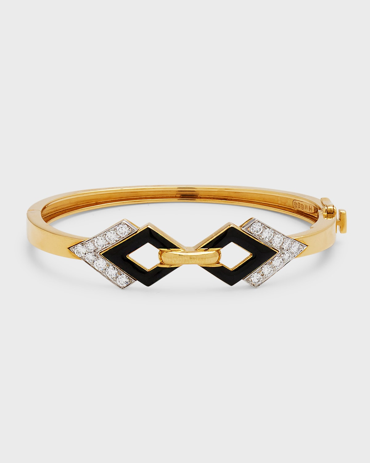 • David Webb bracelet • 18-karat yellow gold and platinum • Black enamel • Diamond, total carat weight: 0.98 CTW • Lobster clasp closure • Approx. 6.5"L x 0.5"W x 0.2"H • Made in USA Online Inquiries: NMS21_PAV28 Store Inquiries: #2626419 Founded in New York City in 1948, David Webb is an iconic luxury house that has consistently redefined fine jewelry with its bold and unique designs. Signature animal pieces, hand-hammered gold work, colorful enamel, carved crystal, and the unique use of opaque gems distinguish David Webb jewels, which are highly sought by leading tastemakers and style icons. Drawing inspiration from a vast archive of over 40,000 original renderings, records, and design ideas, each original piece is expertly handcrafted by long-tenured master jewelers in the David Webb workshop, which sits above the flagship boutique on New York's Upper East Side.