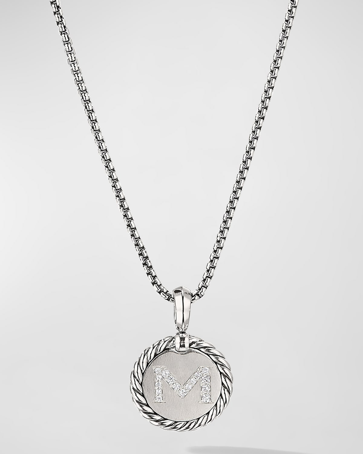David Yurman necklace from the Cable Collectibles® Collection. Polished sterling silver box chain and pendant. Round pendant with cable trim and diamonds. Pave diamond "M" initial; 0.12 total carat weight. Adjustable; lobster clasp. Chain, 1.7mm. Pendant, 18mm. Approx. 1618"L. Imported.