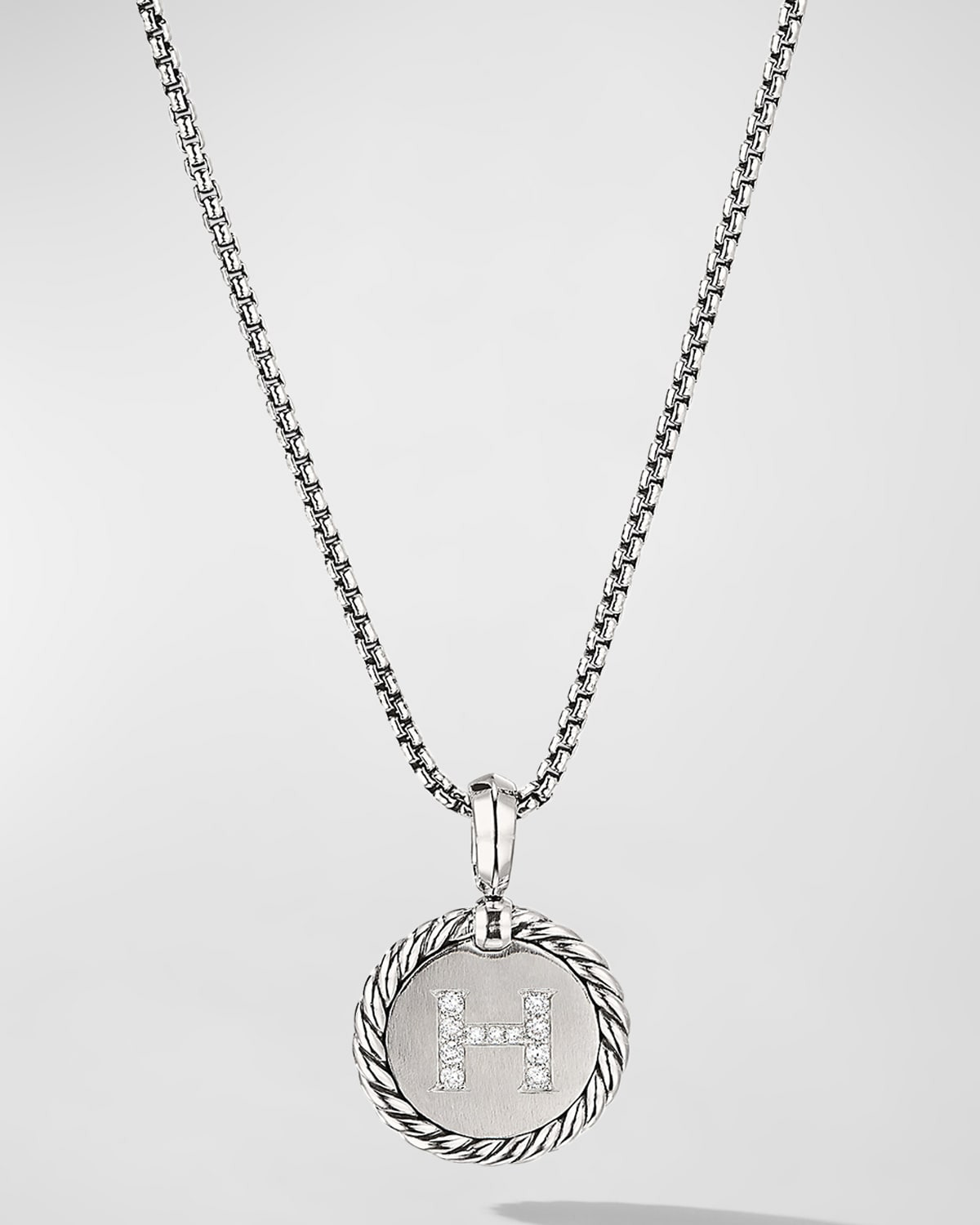 David Yurman necklace from the Cable Collectibles® Collection. Polished sterling silver box chain and pendant. Round pendant with cable trim and diamonds. Pave diamond "H" initial; 0.12 total carat weight. Adjustable; lobster clasp. Chain, 1.7mm. Pendant, 18mm. Approx. 1618"L. Imported.