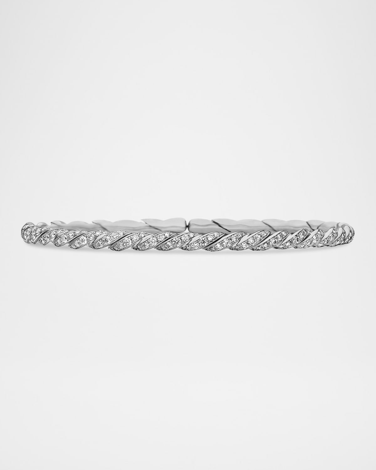 David Yurman "Paveflex" cuff bracelet. Twisted 18karat white gold. Segmented, flexible design set with white diamond pave. 0.99 total diamond carat weight. Approx. 0.1"W (3.4mm). Slipon style.