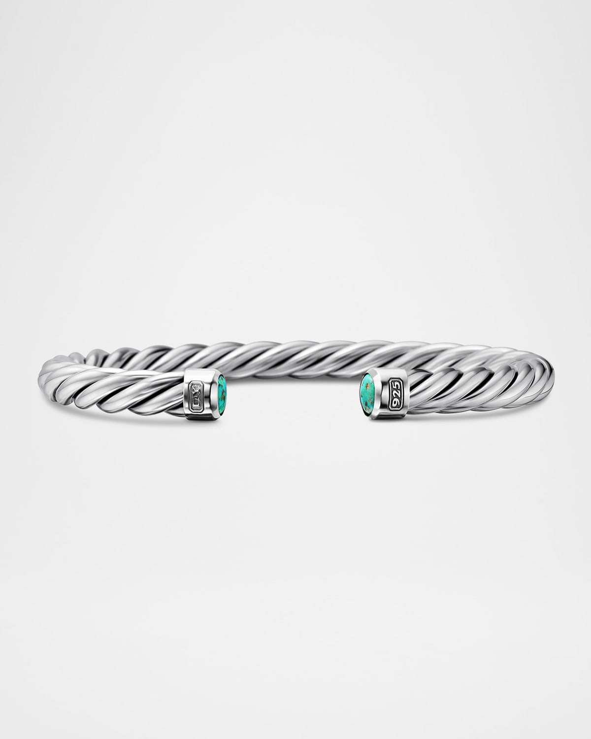 David Yurman bracelet from the Cable Classic Collection. Sterling silver cable cuff. Two round Chinese turquoise stones as end caps. Slipon style. Approx. 6mm wide. Made in USA of imported material.