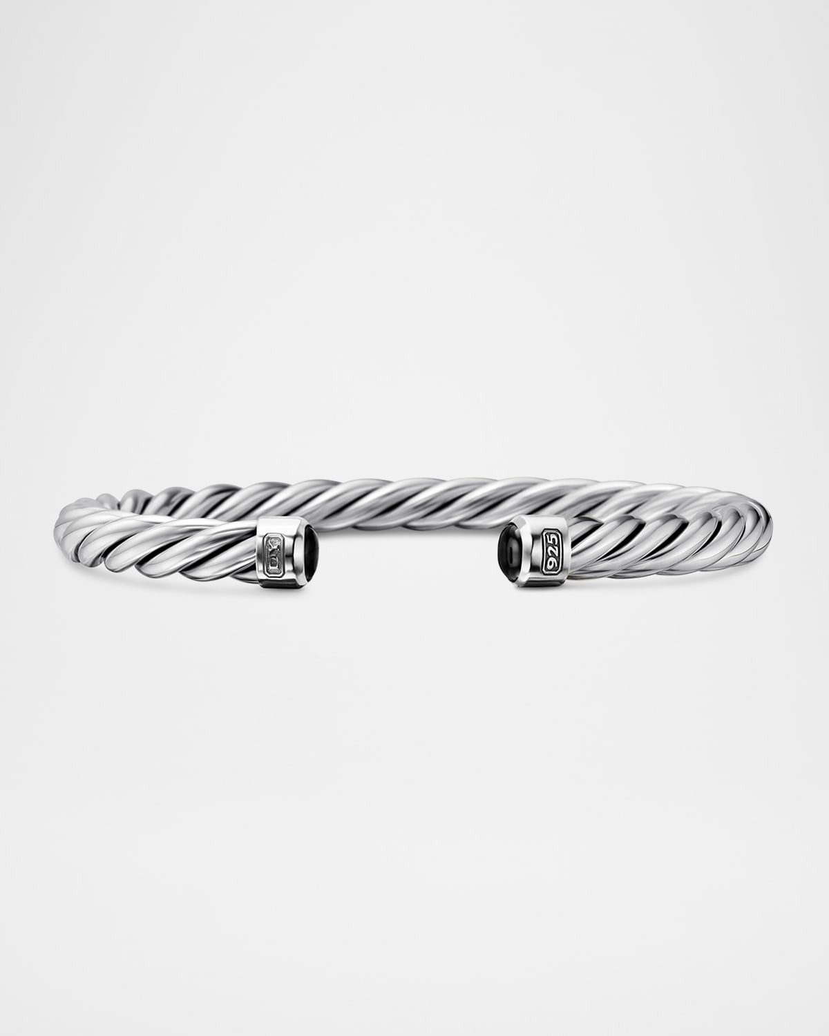 - David Yurman men's bracelet from the Cable Classics Collection. - Signature sterling silver cable cuff and settings. - Two round black onyx as end caps. - Approx. 6mm wide. - Care Instructions: - Use the provided polishing cloth to gently wipe this item clean, then remove any remaining tarnish with mild diluted soap. Rinse with warm water, dry with a clean towel and store it in its jewelry pouch. - Please note: - Styles featuring meteorite should not be exposed to water.