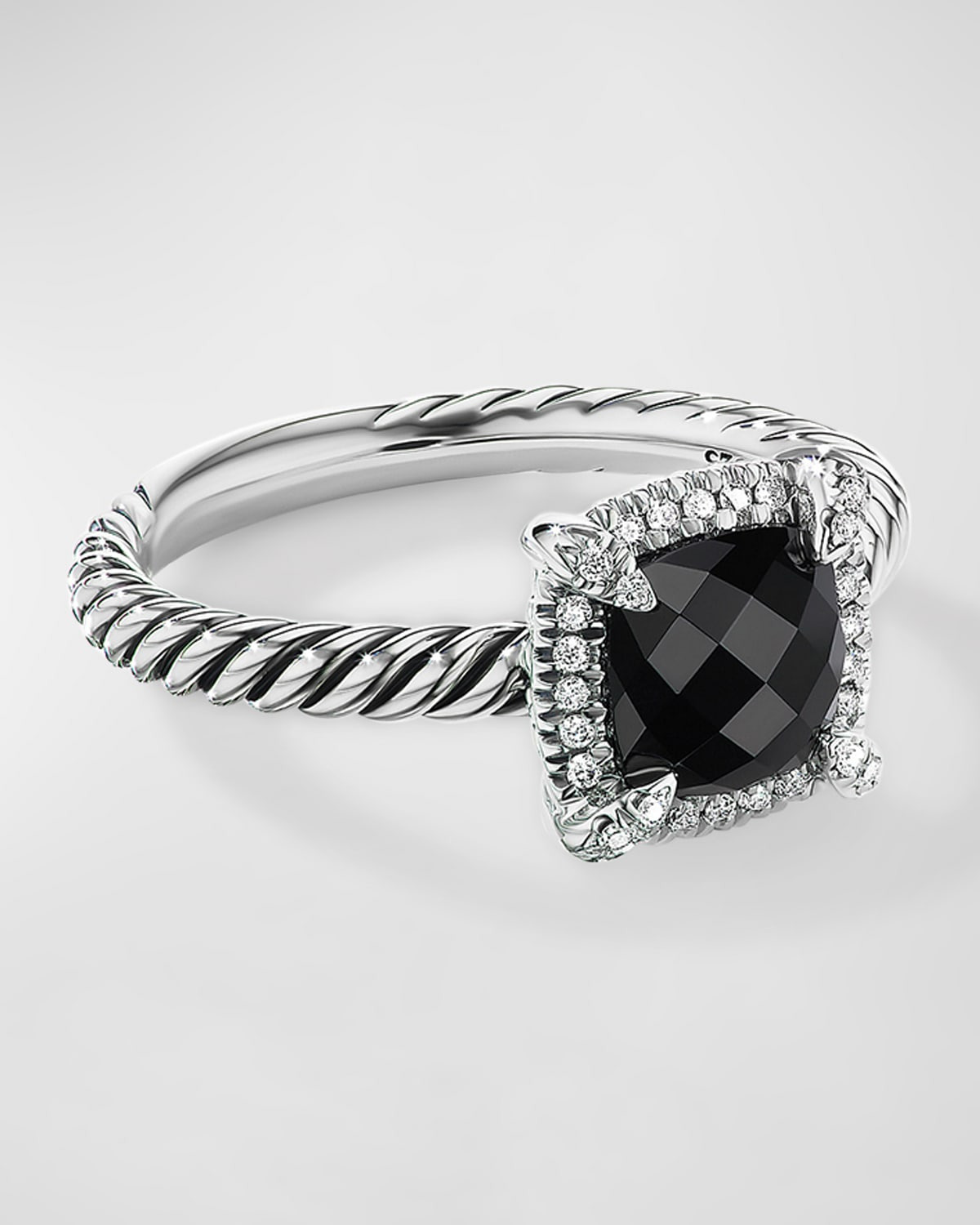 David Yurman ring Approx. 10mm across Sterling silver Cushioncut stone: amethyst, black onyx, blue topaz or prasiolite Paveset diamonds 0.11 total diamond carat weight Size 58. Imported