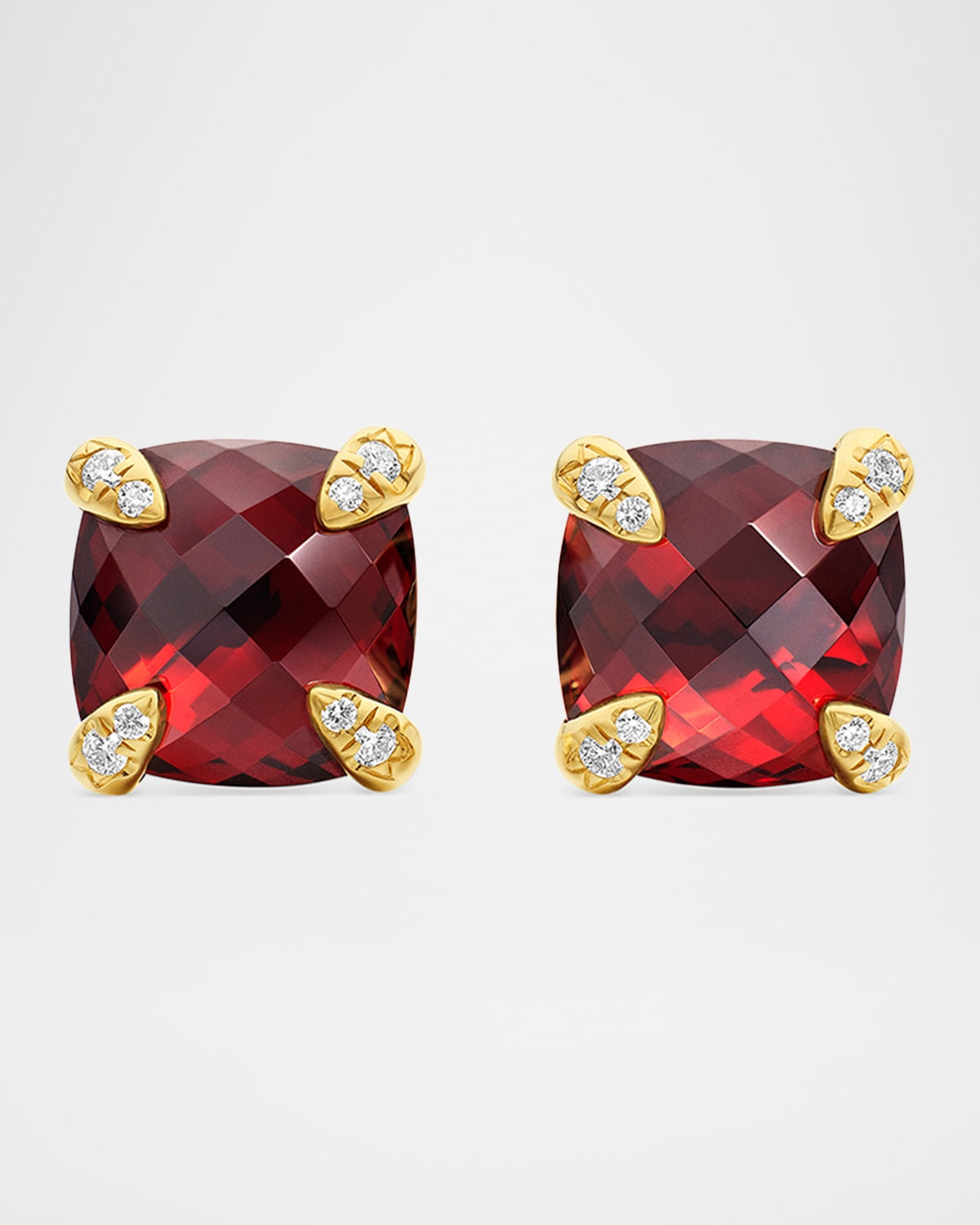 - 18-karat yellow gold - Hampton blue topaz or garnet - Pave diamonds; 0.06 total carat weight - Approx. 8.5mm diameter - For pierced ears - Imported