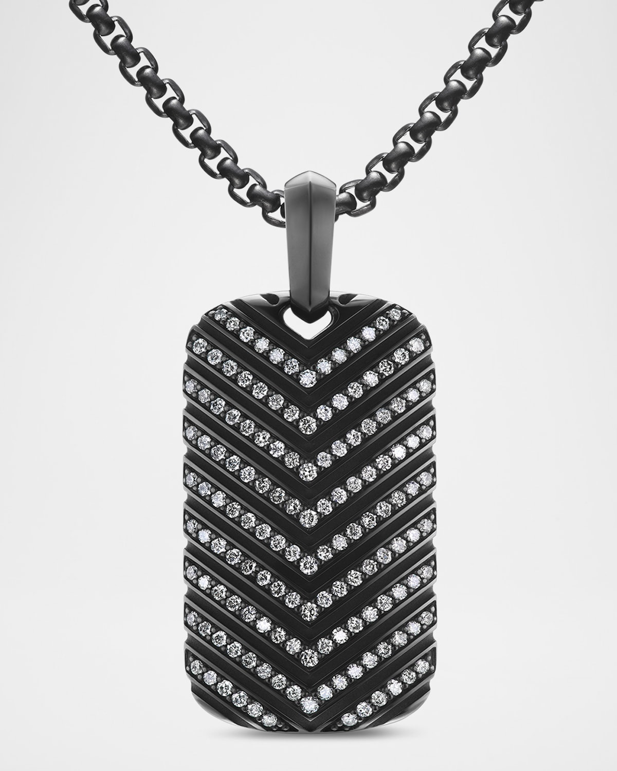- Black titanium - Pave-set diamonds, 0.93 total carat weight - Tag, 34 x 19.5mm - Total length, 44.8mm - Tag only; chain not included - Necklace sold separately - Imported - Care Instructions: - Use the provided polishing cloth to gently wipe this item clean, then remove any remaining tarnish with mild diluted soap. Rinse with warm water, dry with a clean towel and store it in its jewelry pouch. - Please note: - Styles featuring meteorite should not be exposed to water.