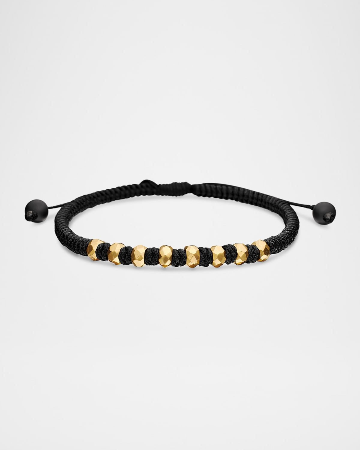 - David Yurman woven nylon bracelet. - 18-karat gold geometric beads. - Slider clasp with cabochon black onyx beads. - Adjustable length. - Care Instructions: - Use the provided polishing cloth to gently wipe this item clean, then remove any remaining tarnish with mild diluted soap. Rinse with warm water, dry with a clean towel and store it in its jewelry pouch. - Please note: - Styles featuring meteorite should not be exposed to water.