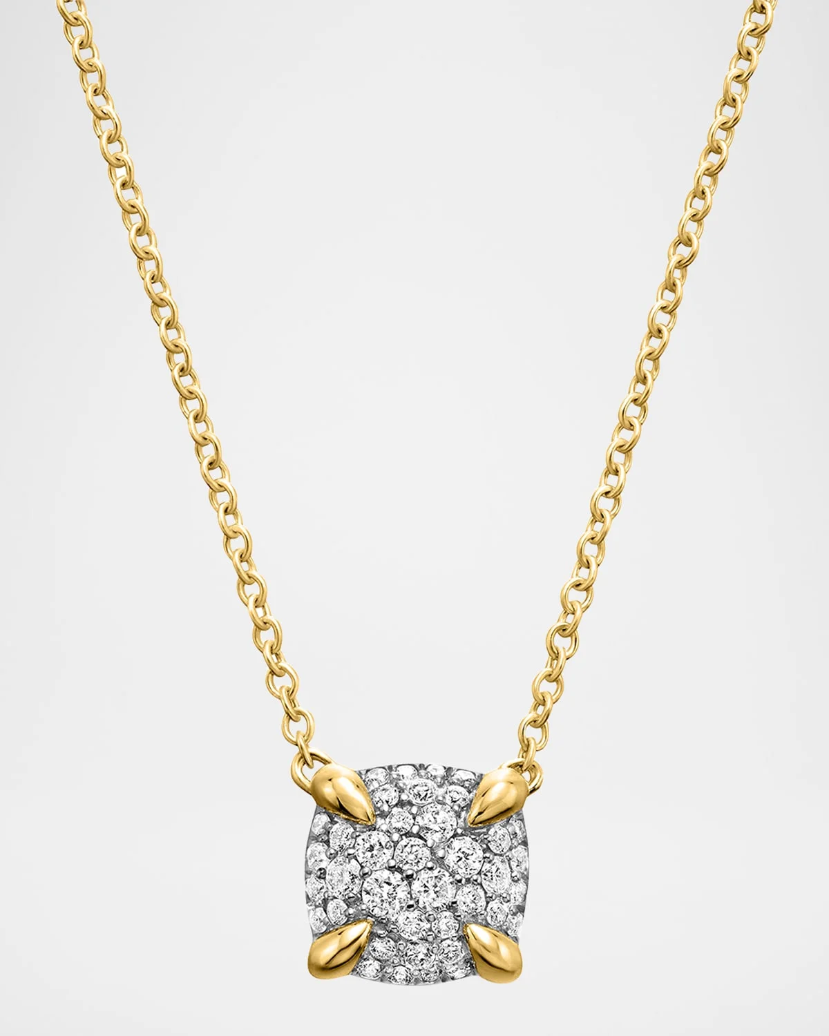 18karat yellow gold Paveset diamonds, 0.15 total carat weight Pendant, 7mm Chain, 1.25mm Lobster clasp Adjustable length, 1618 inches Imported