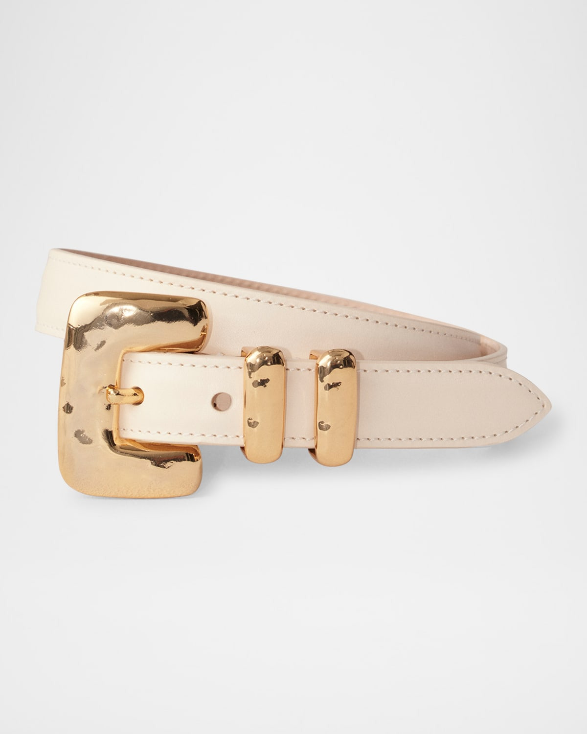 - Dehanche "Tetra" belt in leather and zamak - Approx. 37.5"L - Oversized buckle - Adjustable fit - Cut to size - Professional cleaning recommended, spot clean - Made in Italy