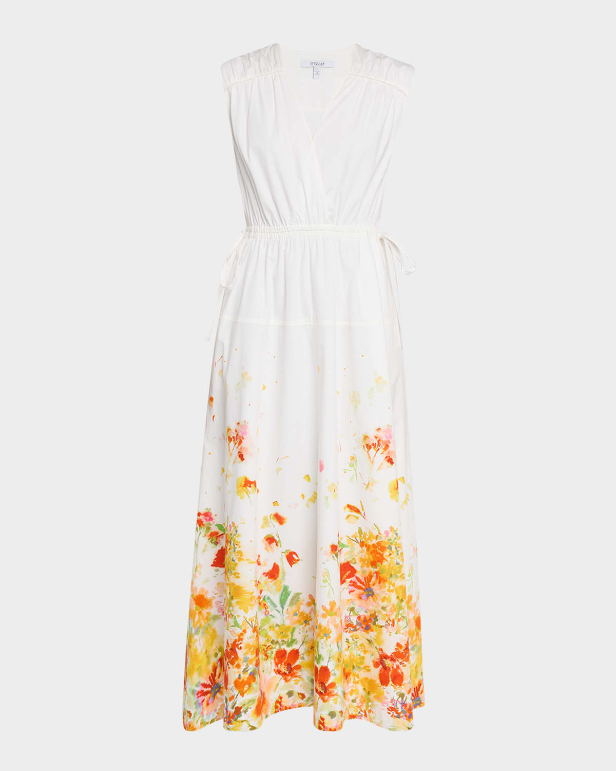 - Derek Lam 10 Crosby "Nara" poplin dress decorated with a vibrant watercolor floral border print - Approx. 52.5"L from shoulder to hem - V neckline - Sleeveless - Self-tie cinched waistband - Full length - A-line silhouette - Slipover style - Cotton - Lining: Cotton - Dry clean - Imported