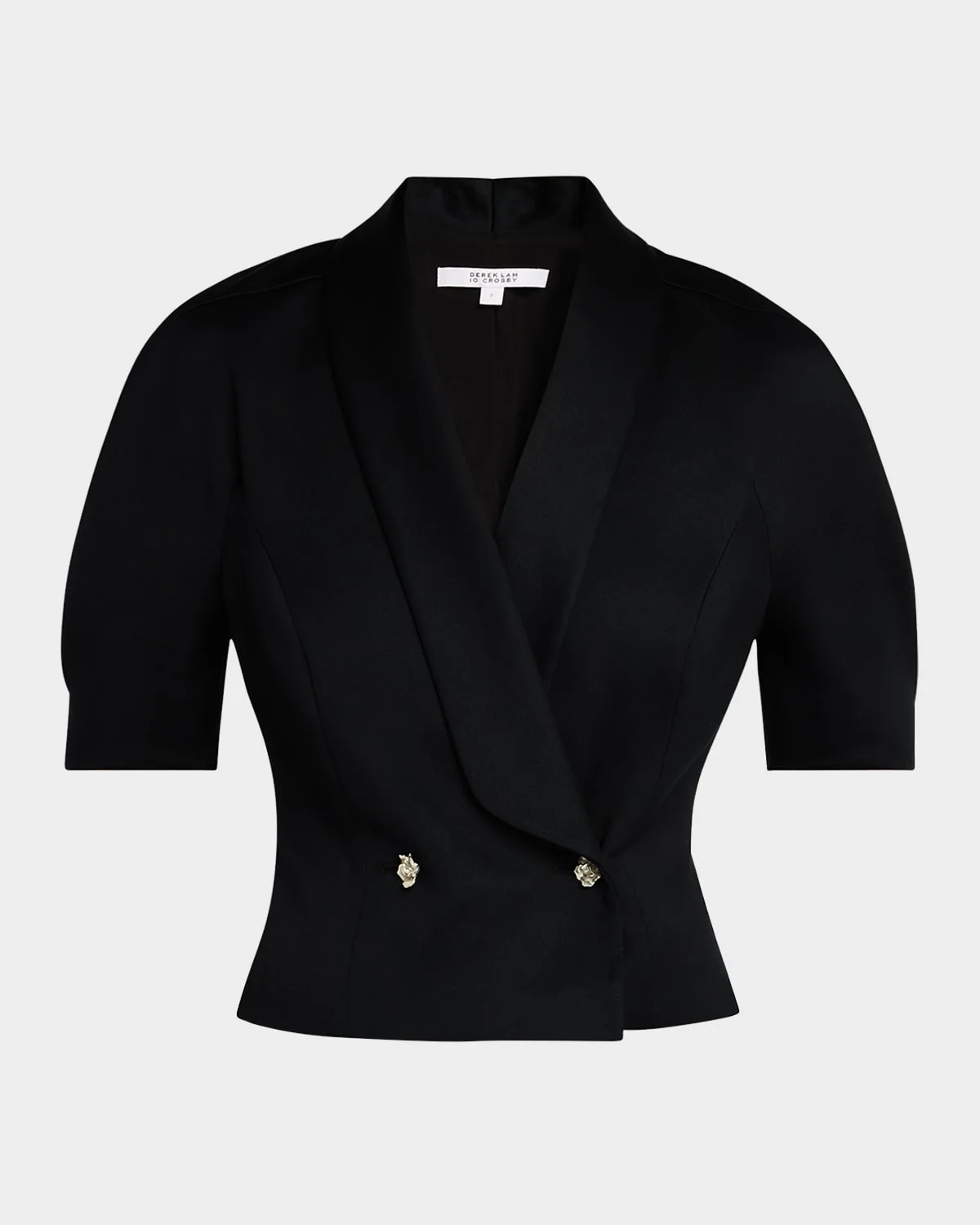 Derek Lam 10 Crosby "Philippe" jacket fetauring rosette novelty buttons and pleated puff sleeves Approx. 20.5"L from shoulder to hem Shawl collar; doublebreasted front Short puff sleeves Slim fit Cropped length Button closure Polyester/spandex Lining: Polyester Dry clean Imported