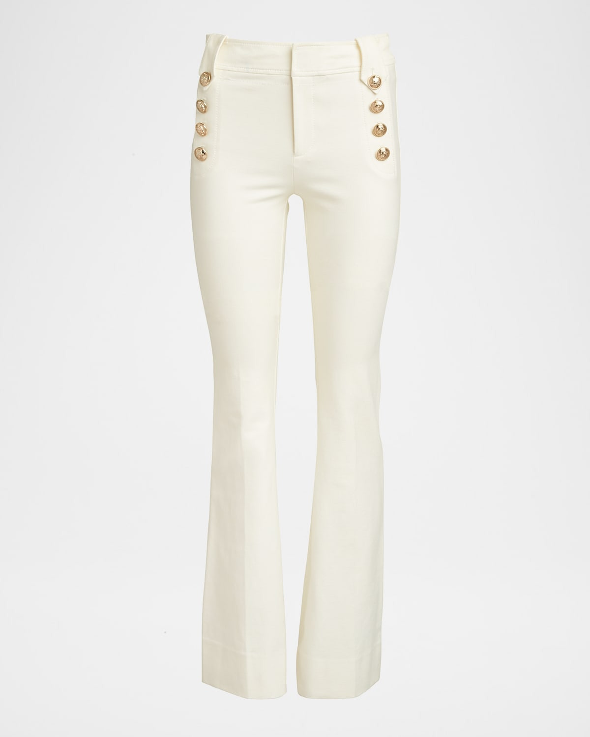 Derek Lam 10 Crosby trousers with sailor buttons. Midrise; concealed fly. Slim fit through thighs. Flared from knees. Cotton/spandex. Imported.