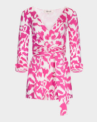 - Diane von Furstenberg "Celeste" abstract-print romper with wrapping waist self-tie - Approx. 28"L from shoulders to hem - V neckline - 3/4 sleeves - Relaxed fit - Step-in style - Viscose/nylon/polyamide - Imported