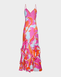 - Diane von Furstenberg "Stella" abstract-print maxi dress with ruffles and braided trim - Approx. 53.5"L from shoulders to hem - V neckline - Sleeveless - Low-cut back - Full length - A-line silhouette - Invisible back zipper - Viscose - Imported