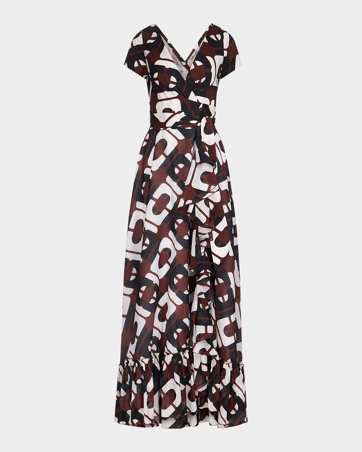 - Diane von Furstenberg "Vivianna" maxi wrap dress in geometric Cane Link print - Surplice neckline; wrap front - Short sleeves - Waist self-tie - Flounce ruffle hem - Full length - A-line silhouette - Cotton/silk - Imported