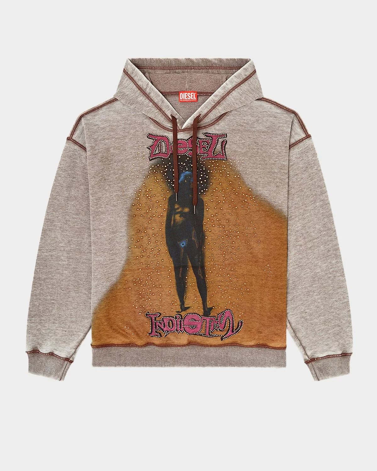 This Diesel hoodie is made from a cotton blend with a burnout-washed treatment that enhances its worn look. Eye-catching all-over print decorated with & nbsp;studs on the front Contrast stitching Hooded drawstring neckline with plastic ends Elasticated ribbed cuffs and hem Dropped shoulder Pullover style Polyester/cotton Hand wash Imported