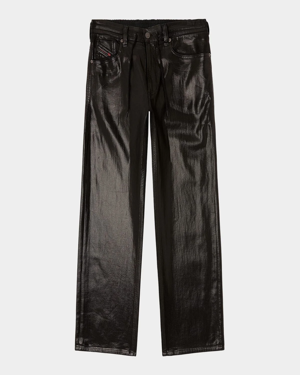 These Diesel pants offer fabric treated with multiple layers of coating to create an extremely smooth, supple texture, enriched by a black spray application. Pressing technique lends a distinctive sheen Regular rise Five-pocket style Relaxed fit through straight legs Button-zip front; belt loops Elasticized back waistband Cotton/elastane/spandex Machine wash cold Imported