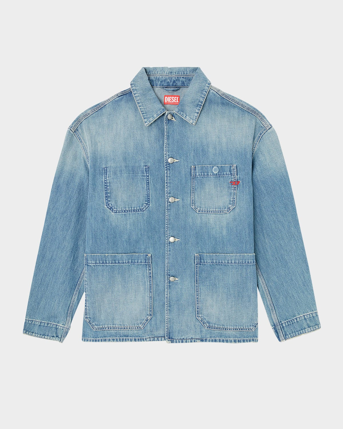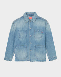 - Diesel shacket made with a high percentage of regenerative cotton, with a light wash for a clean, contemporary finish - Embroidered red D monogram - Shirt collar - Button front - Branded metal buttons - Four wide patch pockets with squared corners - Long sleeves - Single-button cuffs - Reinforced stitching - Relaxed fit - Cotton - Machine wash cold - Imported