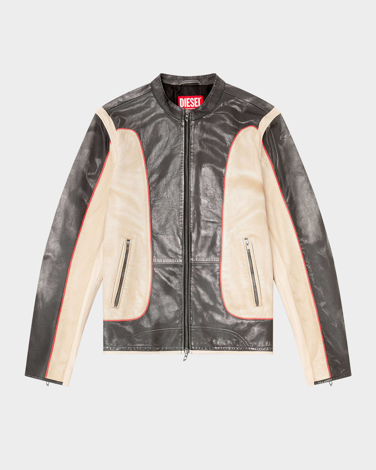 - Diesel moto jacket in responsibly sourced vegetable-tanned leather, characterized with a color block design and contrast piping - Band collar - Full-zip front - Side zip pockets - Long sleeves - Zipped cuffs - Classic fit - Leather - Wipe clean - Made in Italy