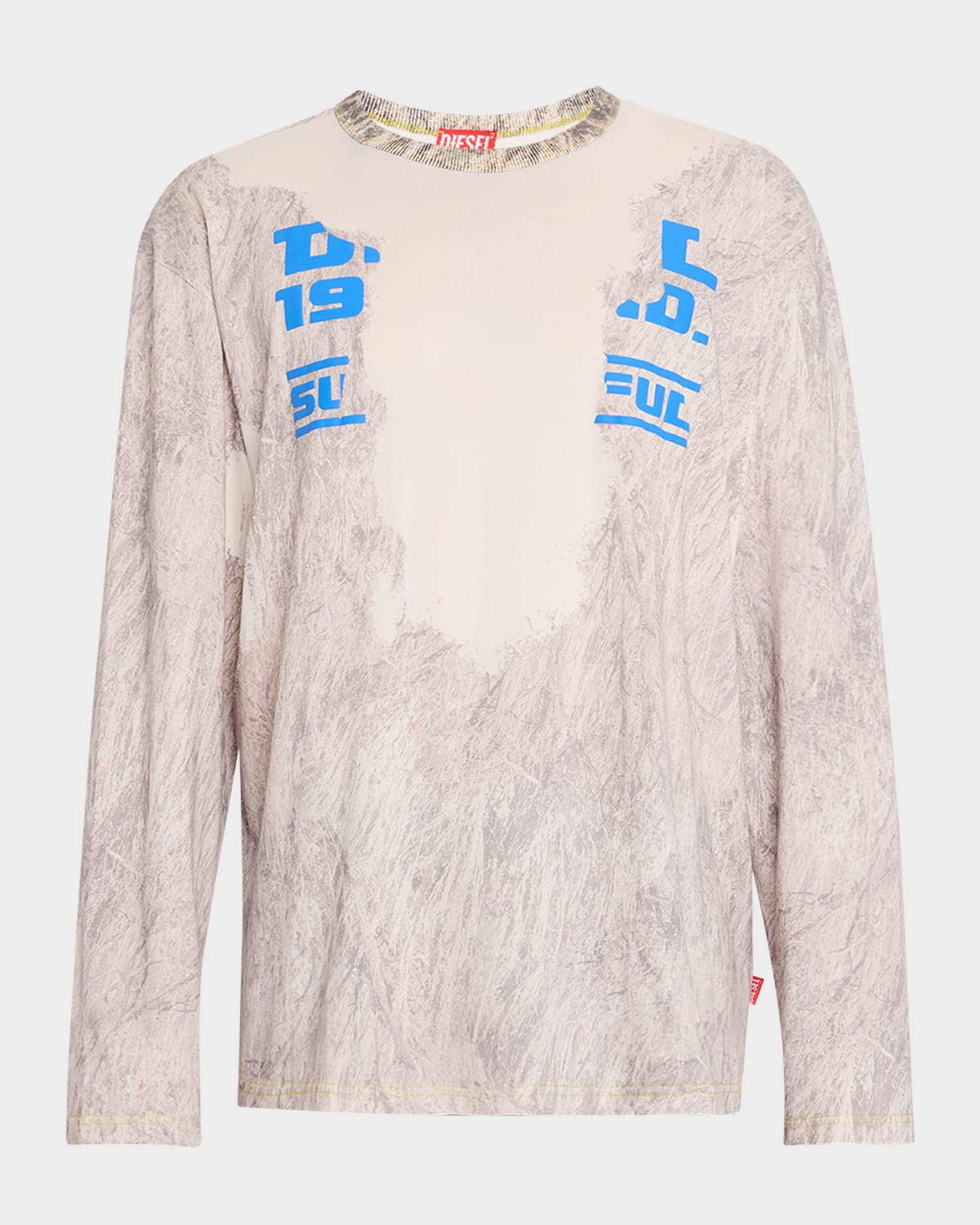 - Diesel T-shirt in camouflage print with burnout devore effect - Broken puff print logo on front - Crew neckline - Long sleeves - Relaxed fit - Pullover style - Polyester/cotton/polyester - Machine wash cold, line dry - Made in Bulgaria - Model is 6'1"/185cm.