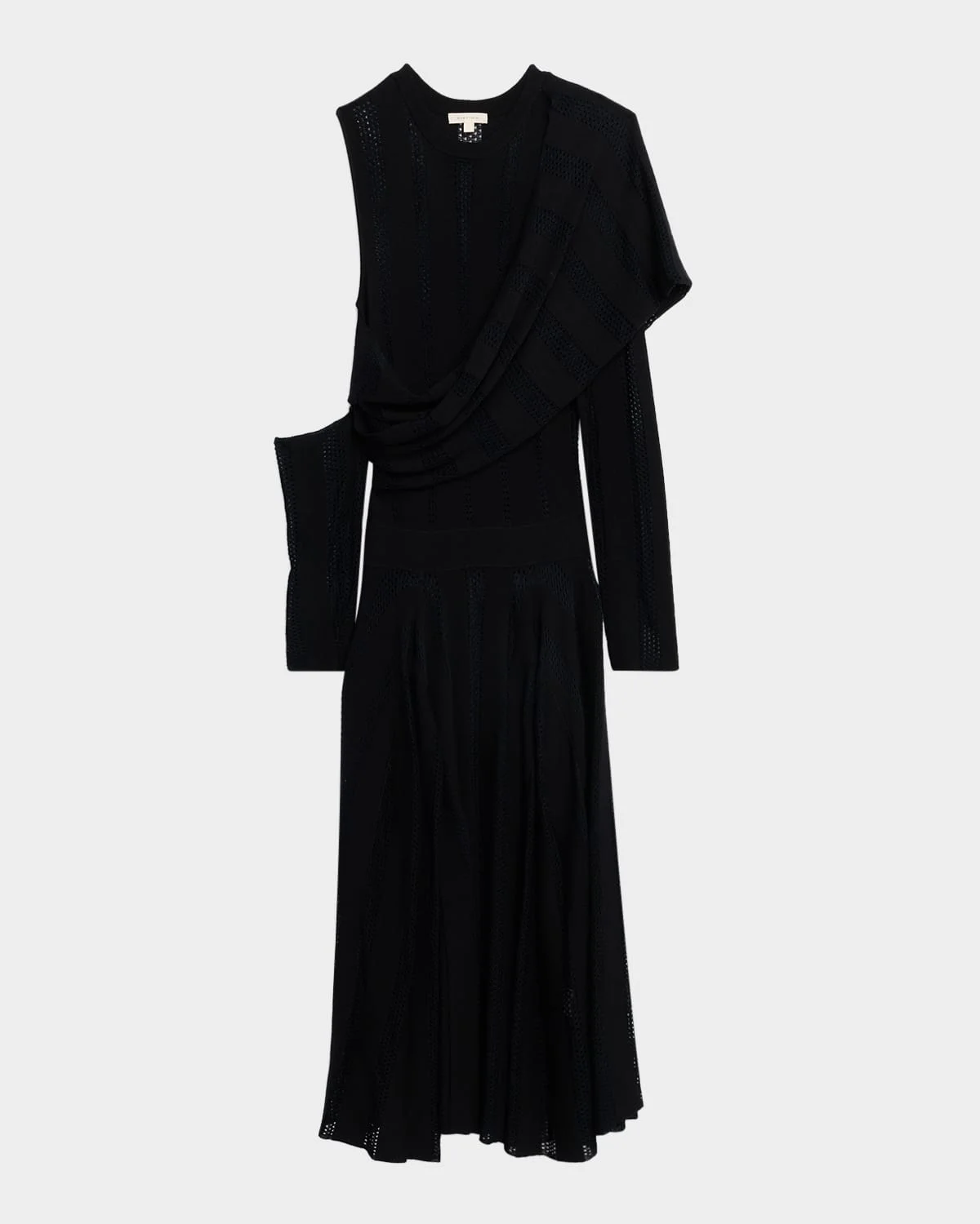 Diotima dress is crafted of a striped open knit featuring a removable shrug draped off the shoulder and a godet flare skirt Round neckline Long sleeves Aline silhouette Ankle length Slipover style Merino wool/viscose Professional cleaning recommended Imported