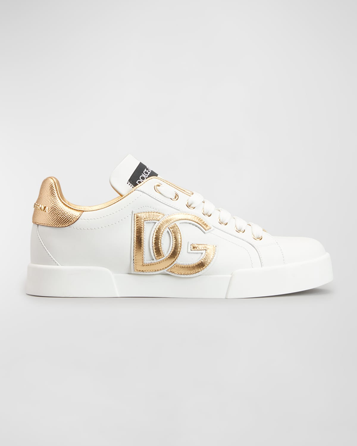 - Dolce&Gabbana calf leather low-top sneakers with contrast backstay and metallic logo accent - Flat heel - Round toe - Lace-up vamp - Lightweight, sturdy TPU outsole - Lining: Leather/polyester - Made in Italy