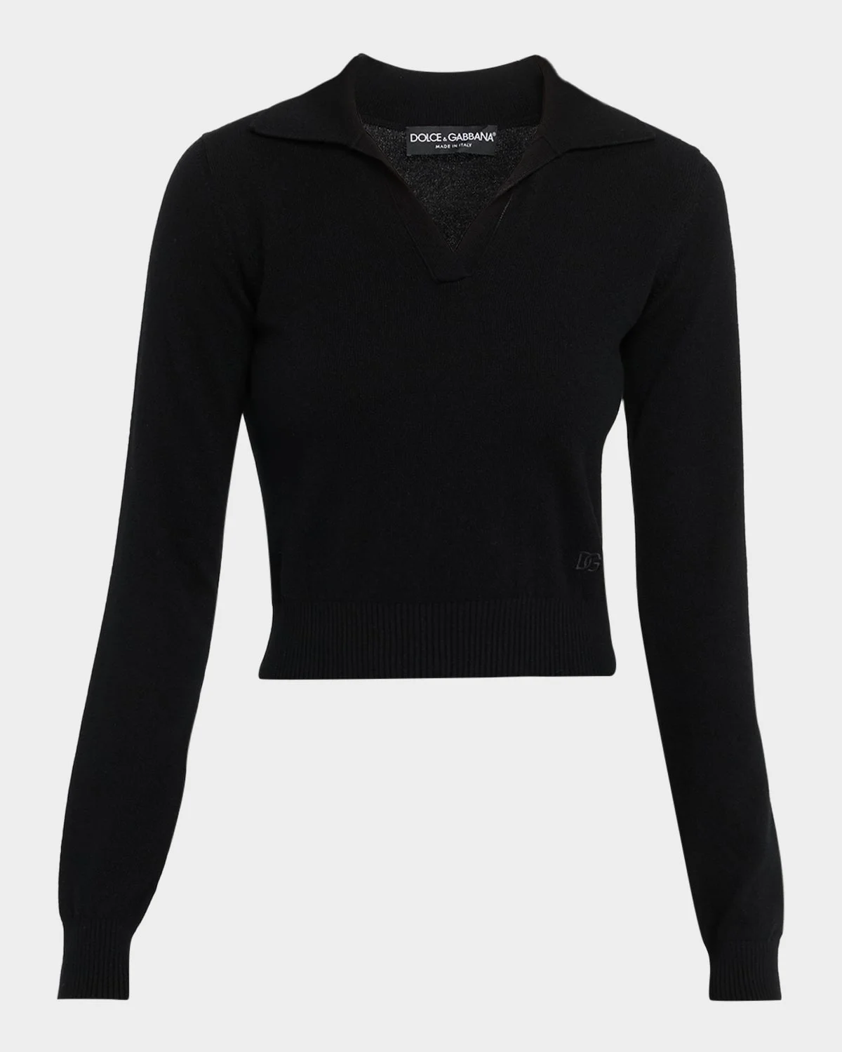 - Dolce&Gabbana knit henley sweater with a monogram embroidered hip - Spread henley collar; split V front - Long sleeves - Slim fit - Cropped length - Ribbed cuffs and hem - Pullover style - Cashmere - Made in Italy