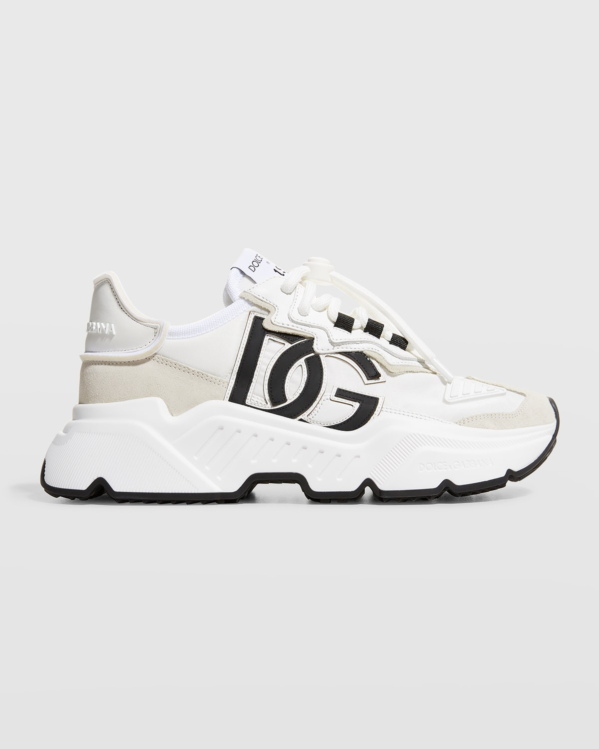 - Dolce&Gabbana "Daymaster" running sneakers in nylon, calf suede and leather. - Flat chunky heel. - Reinforced round toe. - Drawstring lace-up vamp. - Contrast DG applique at side. - Rubber sole. - Runs small; order 1/2 size up. - Made in Italy. - Size Note: Item runs small, consider ordering a size up.