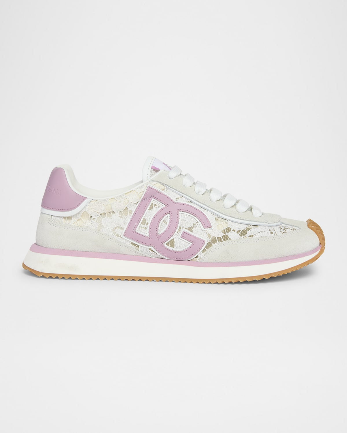 - Dolce&Gabbana running sneakers in lace, nylon, suede, and leather with contrast DG logo - 0.17 in / 5 mm flat heel - Reinforced round toe - Lace-up vamp - Branded tongue - Cushioned footbed - Rubber sole - Professional cleaning recommended, spot clean - Made in Italy
