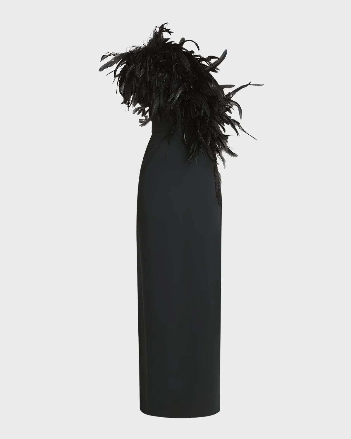 Dolce & amp;Gabbana asymmetric stretch-cady gown featuring a multi-feather embellished neckline and a high side slit One-shoulder neckline Sleeveless Column silhouette Full length Hidden closure Rayon/cellulose acetate/spandex/feather Made in Italy Model is 5 & apos;10"/177cm.