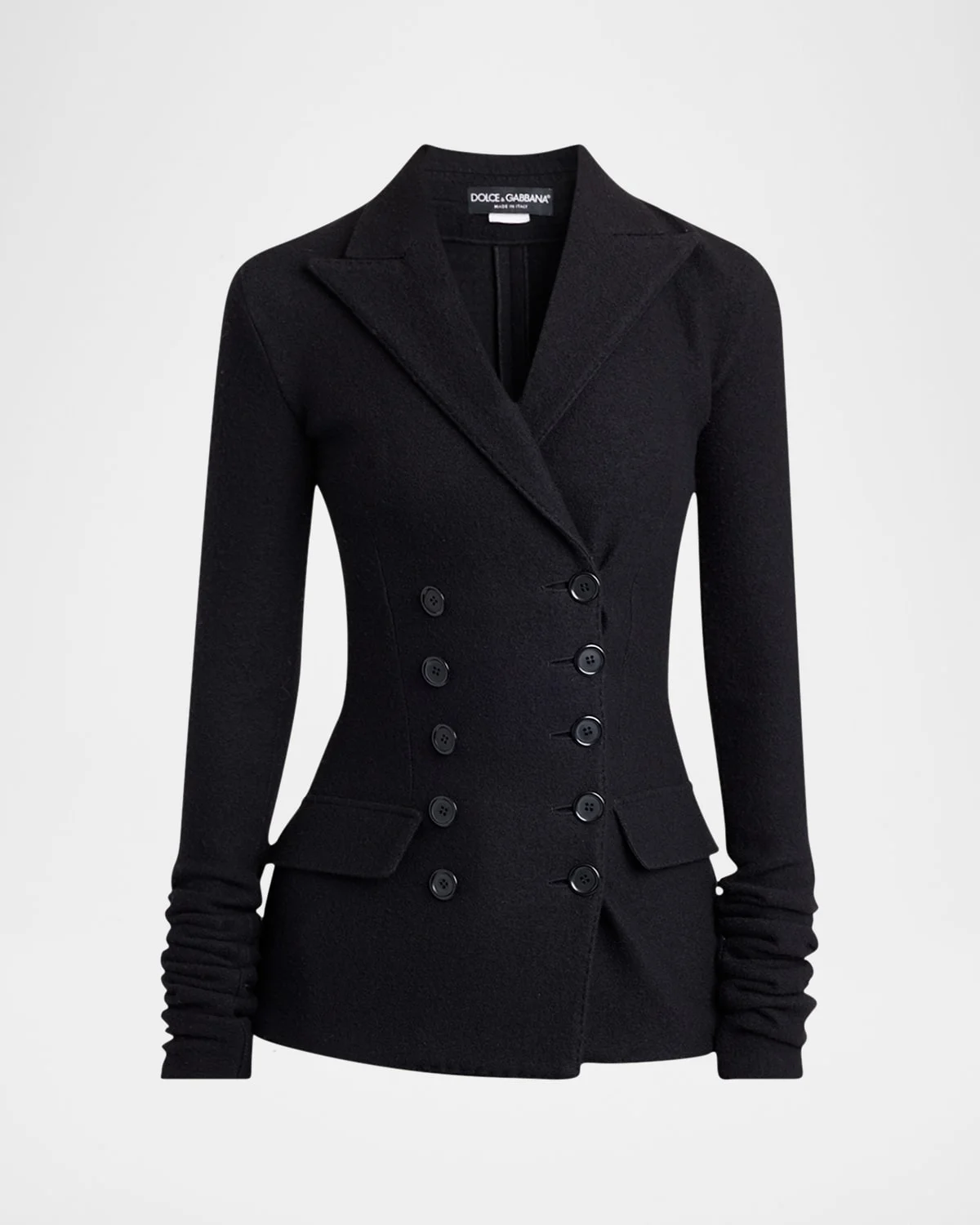 Dolceamp;Gabbana fitted blazer in brushed wool with scrunched cuffs Peak lapels; doublebreasted front Long sleeves Hip flap pockets Fitted Hem falls below the hip Virgin wool Made in Italy