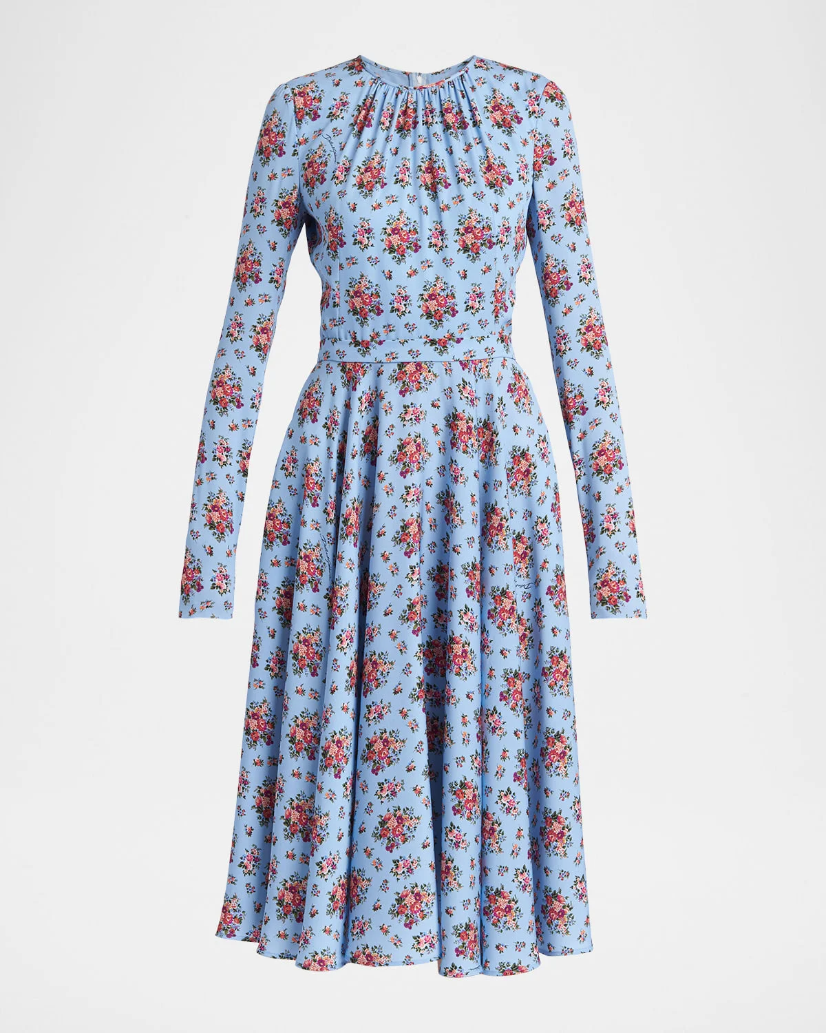 A micro floral print and delicate gathered neckline give this Dolce & amp;Gabbana dress its vintage-inspired style and feminine charm. Round neckline Long sleeves Side slip pockets Hem falls below the knee A-line silhouette Concealed back zip closure Silk/elastane Made in Italy