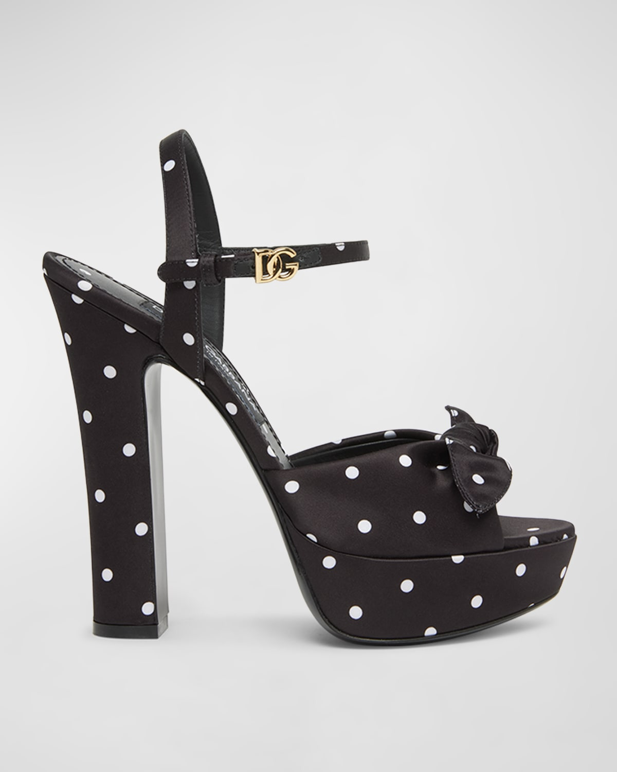 - Dolce&Gabbana "Keira" polka dot satin platform sandals with knotted bow accent - 5.31 in / 135 mm block heel - Open toe - Adjustable ankle strap - Leather outsole - Made in Italy