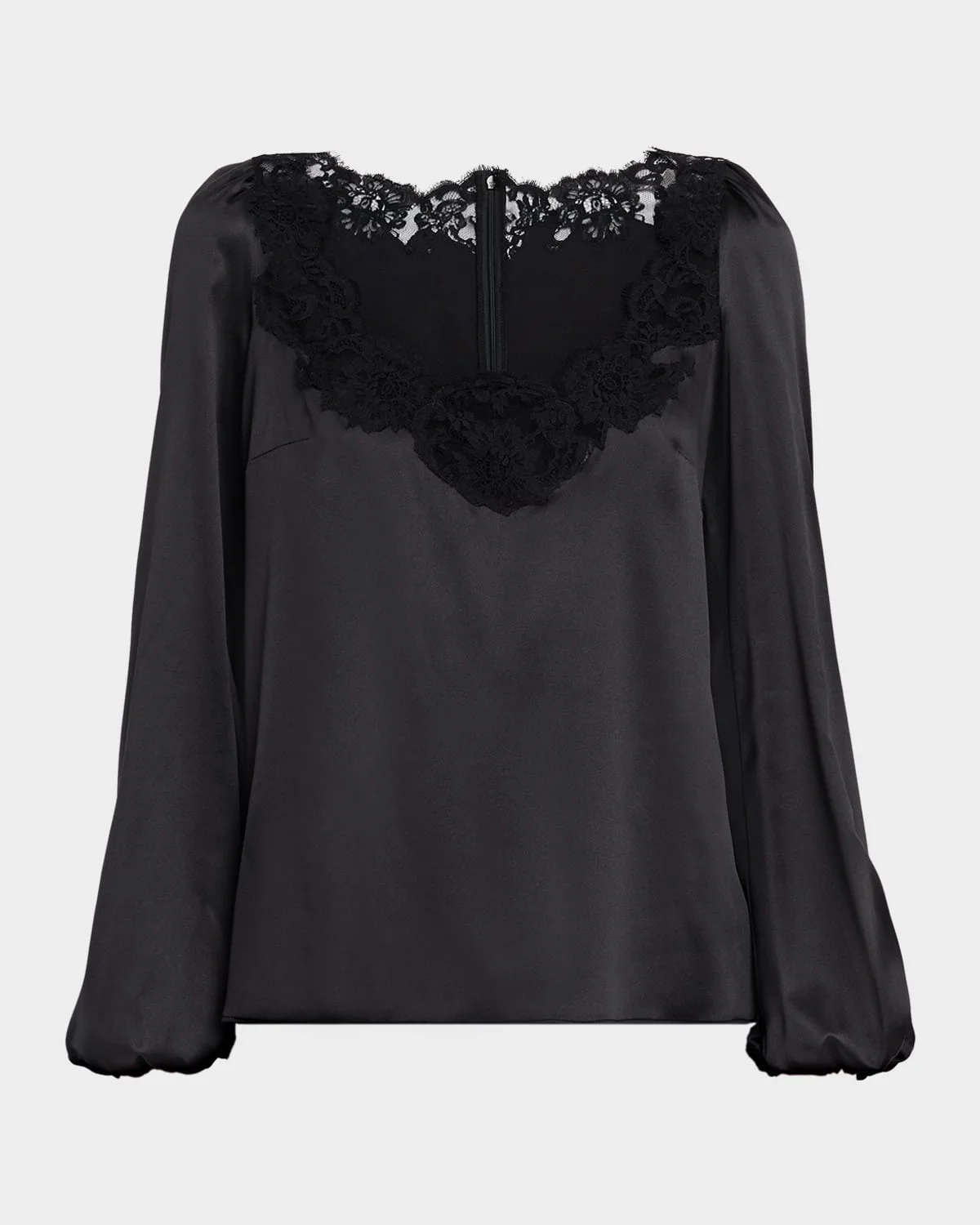 Lace-Trim Balloon-Sleeve Silk Blouse